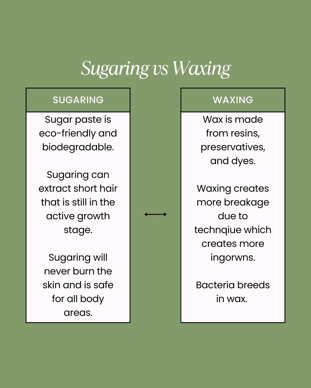 Sugaring is a natural hair removal method made from sugar, water, and lemon. It's gentle on the skin, removes hair in its natural direction, and is safe for even the most sensitive areas, leaving you smooth and irritation-free.